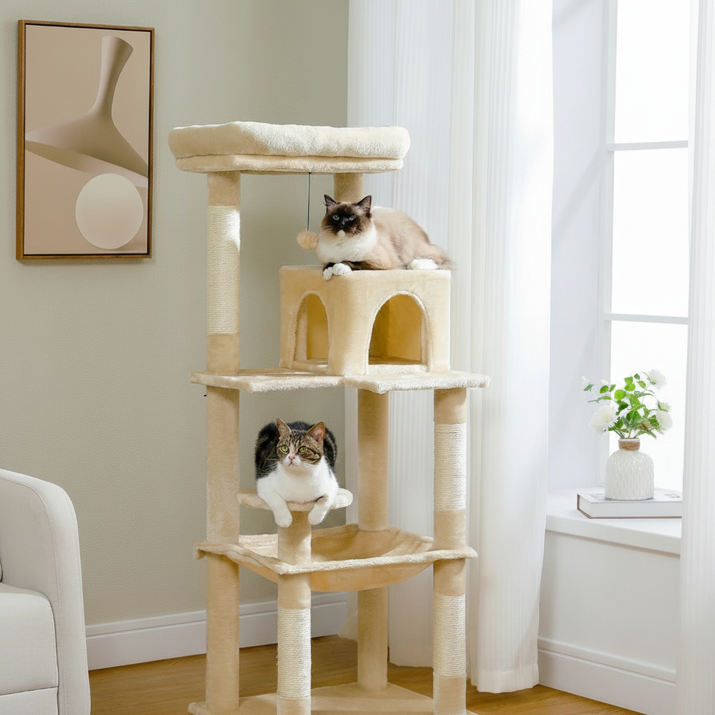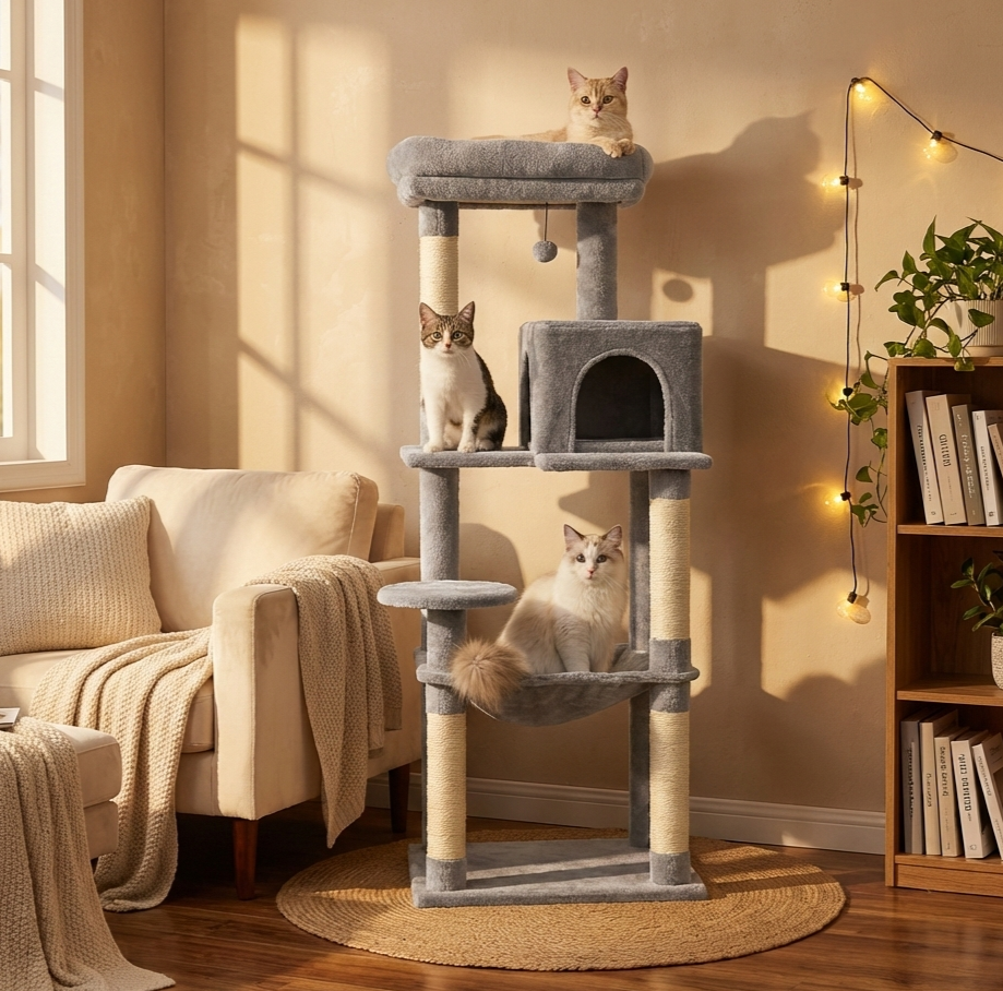 Standing at 143cm (56"), the tower spreads its platforms across a comfortable vertical range. Cats can climb, rest, and observe from different heights without feeling cramped.