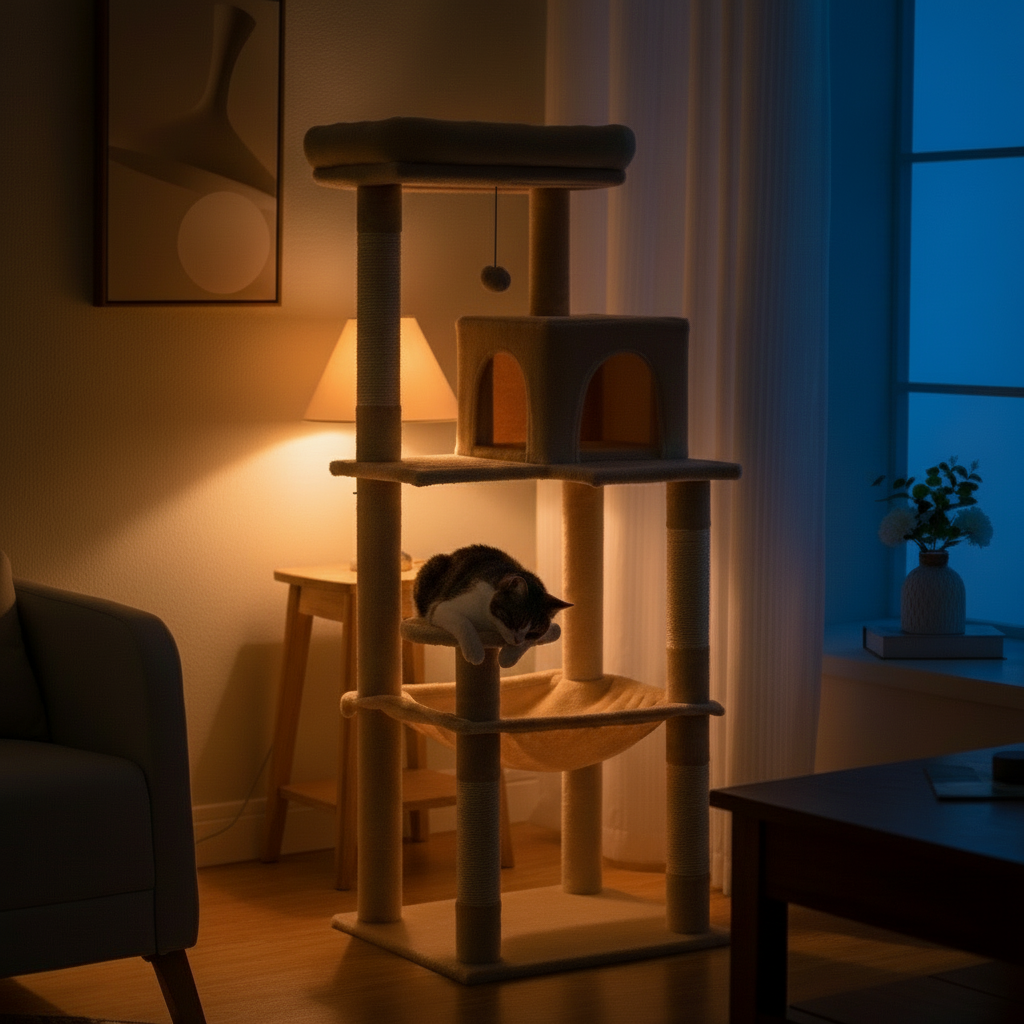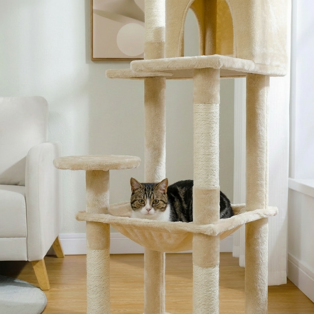 The oversized hammock supports full-body lounging for cats up to 25+ lbs. A spacious enclosed condo allows easy entry and turning, while the top perch provides a stable elevated view.